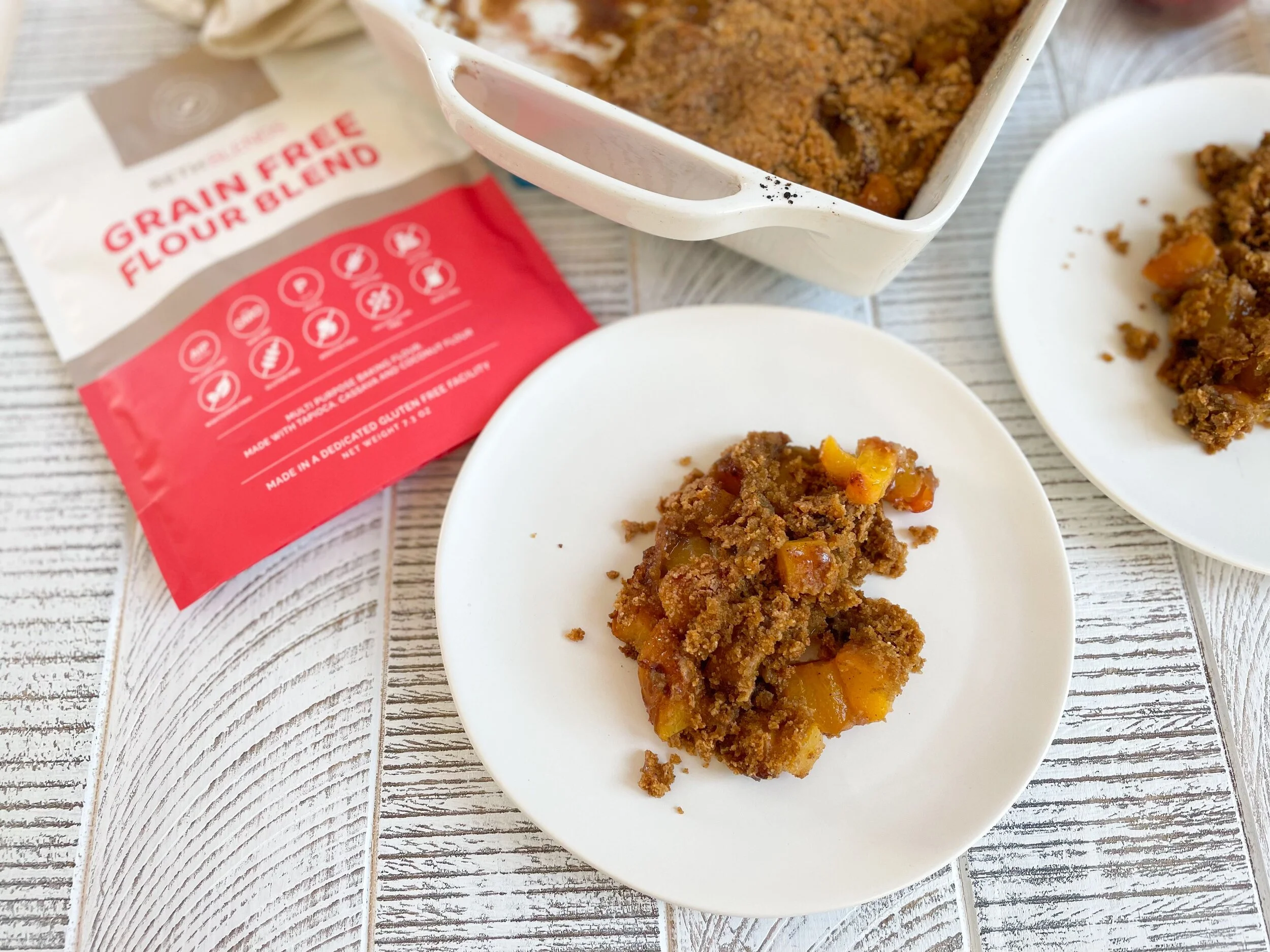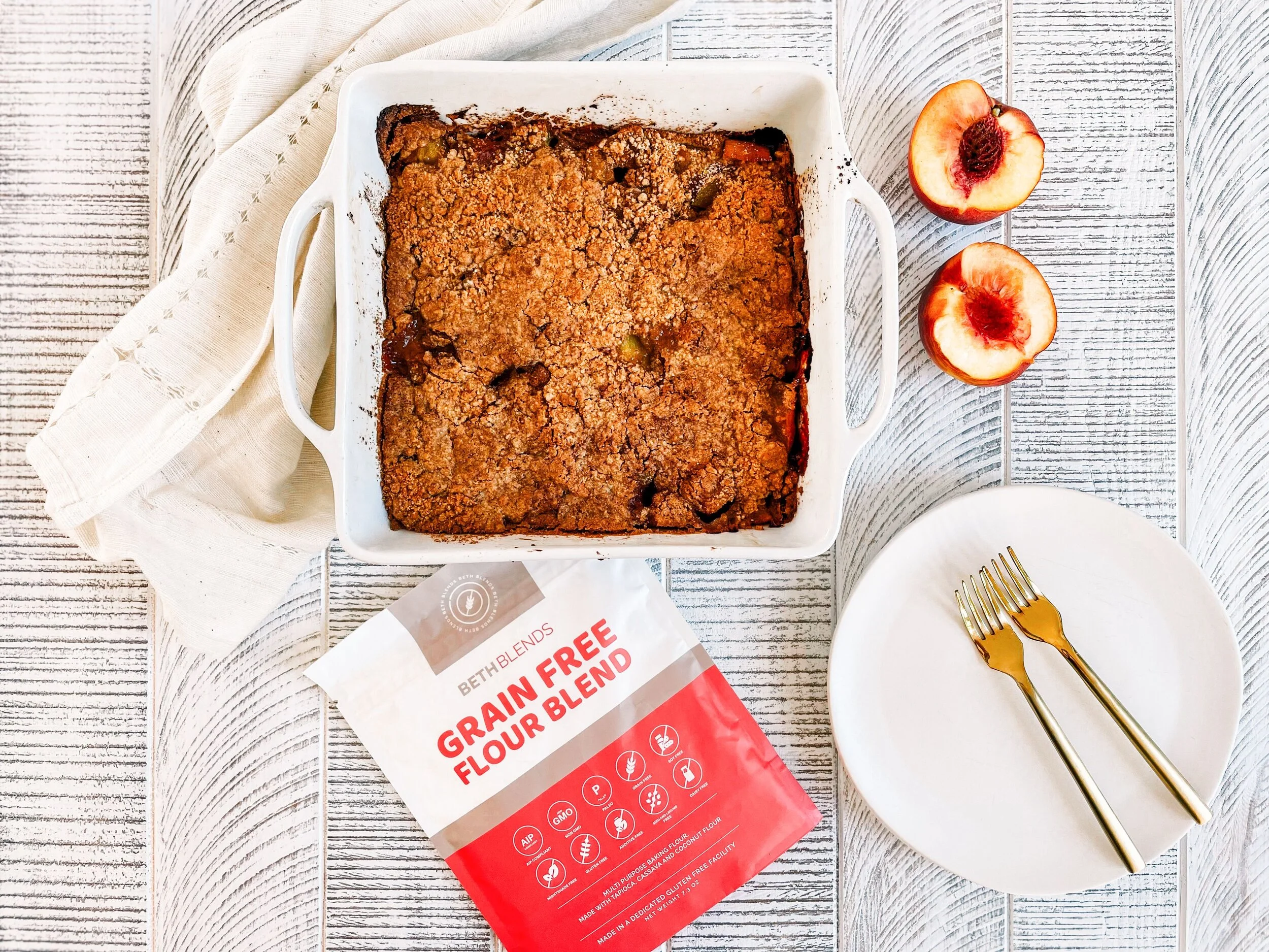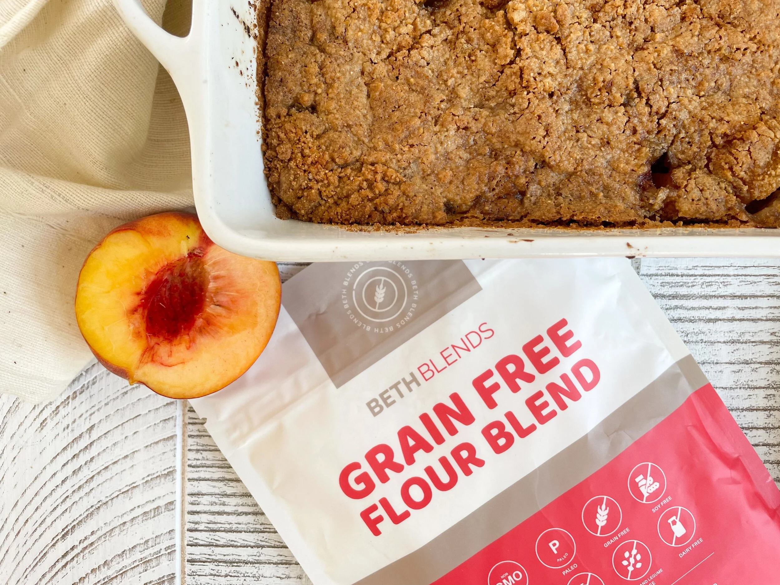 /This grain free peach cobbler comes together quickly with fresh peaches, lemon, and a cinnamon streusel baked on top with Beths Blends Grain Free Flour! Your guests will be asking for seconds and not missing the grains in this cobbler!