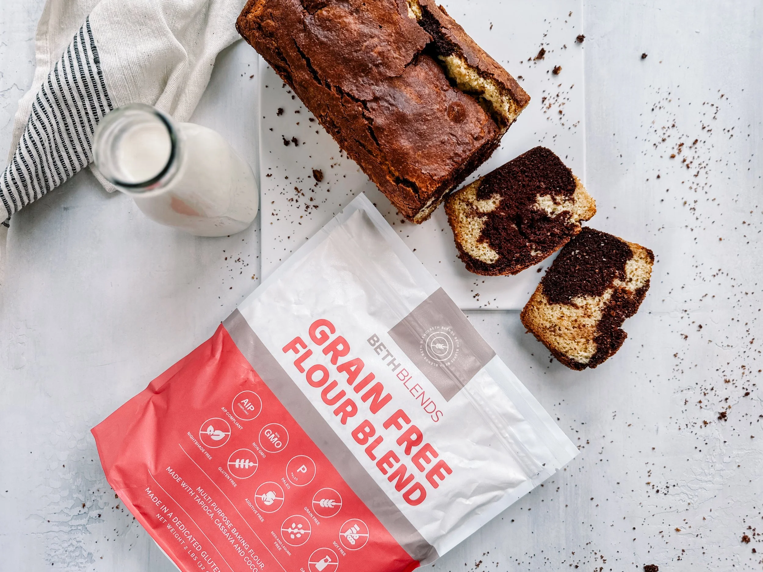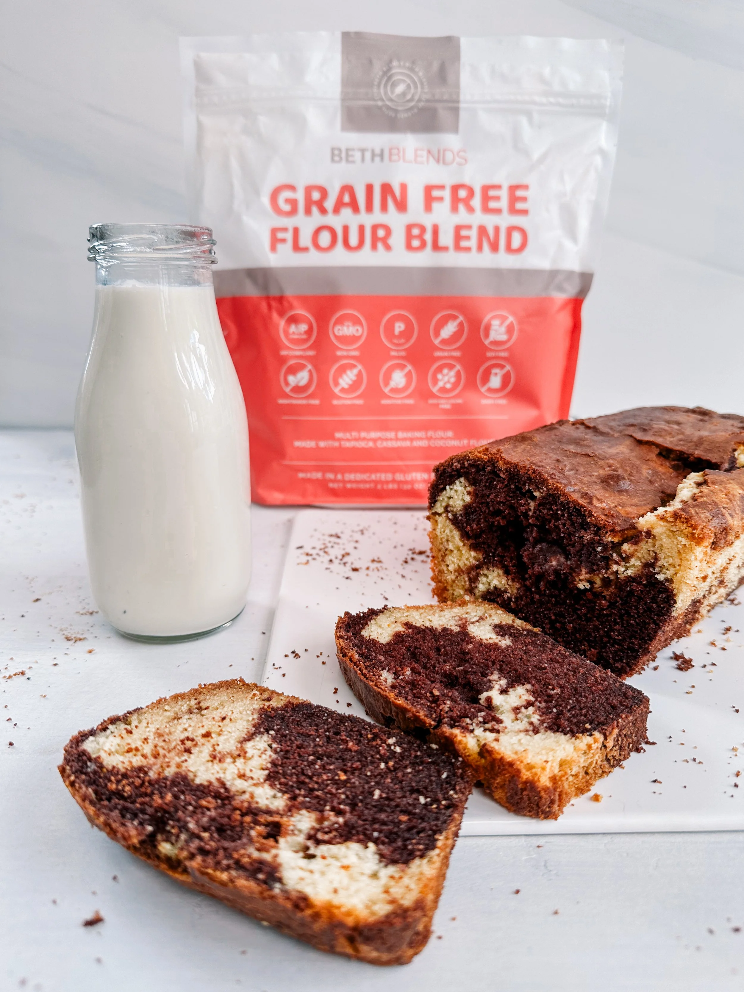 /Looking for a healthy and delicious dessert recipe? Look no further than this mouth-watering marble pound cake! Made with Beth's Blends grain-free flour, this cake is gluten-free, grain-free, and free from refined sugars and dairy.