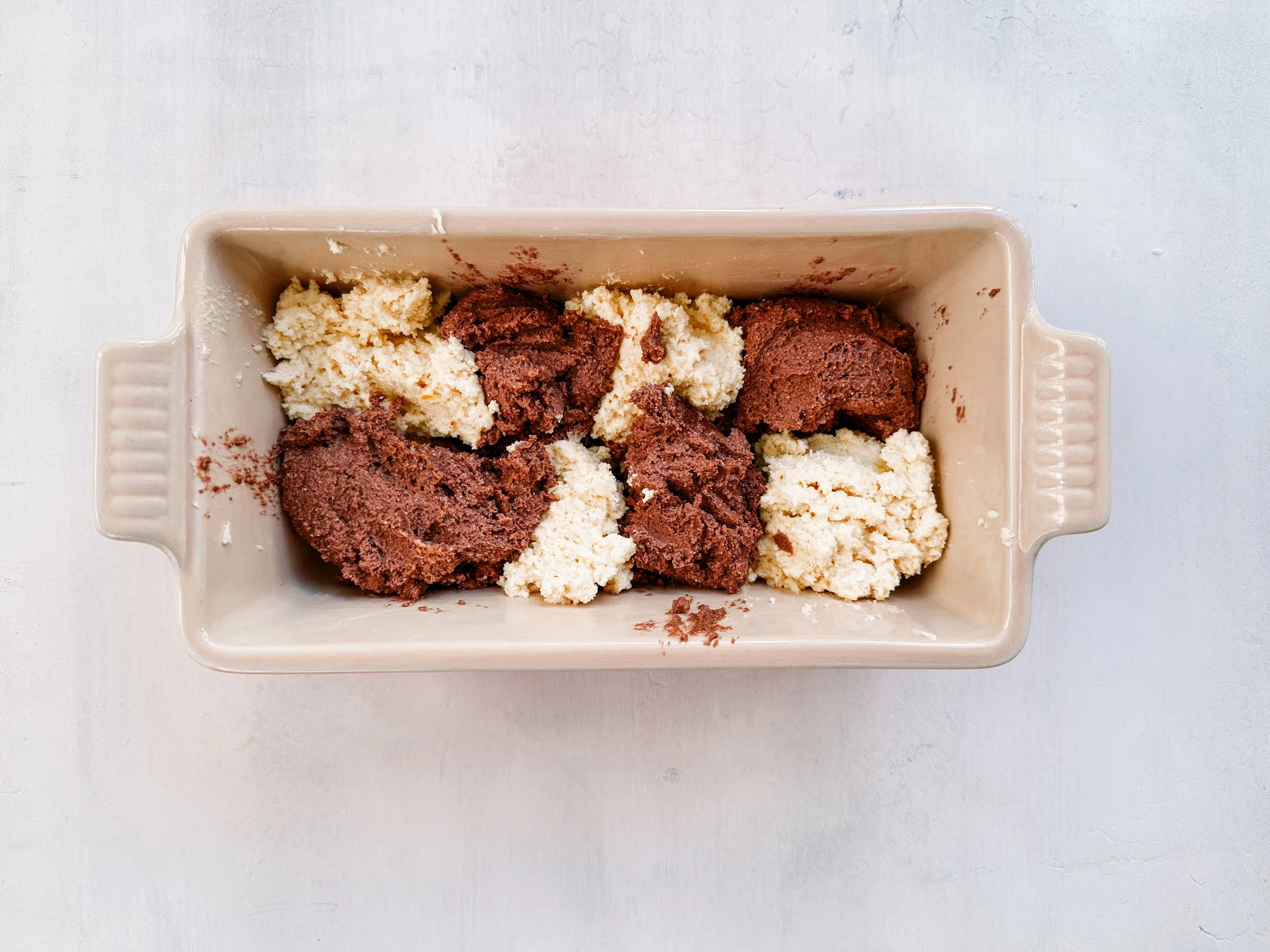8. Spoon batter into the loaf pan alternating plain and cocoa batter.