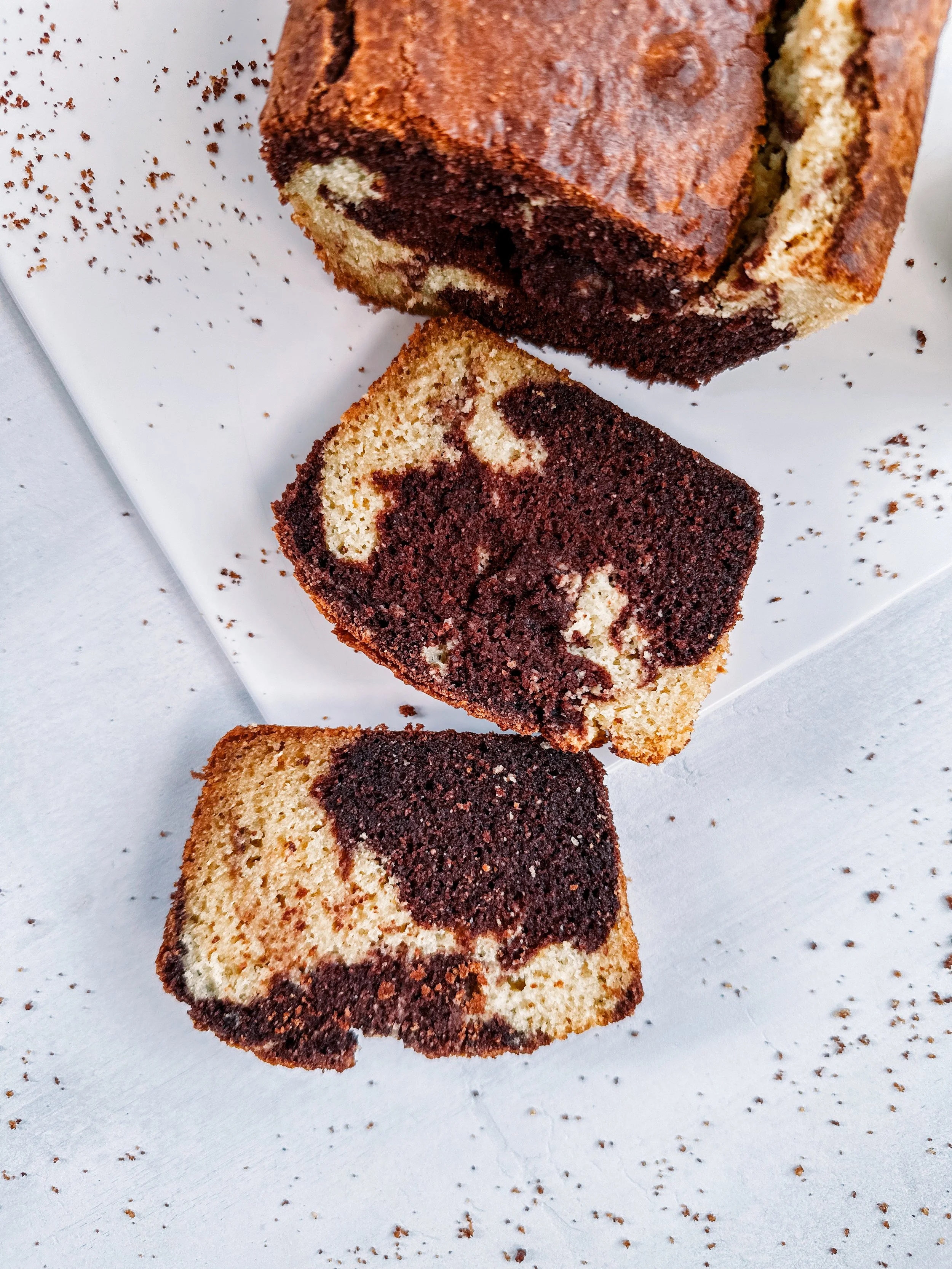 What makes this pound cake even more special is the beautiful marbled effect created by the combination of cacao powder and vanilla extract in the batter. It's a perfect dessert to serve at any occasion, or simply as a sweet treat to indulge in at home.