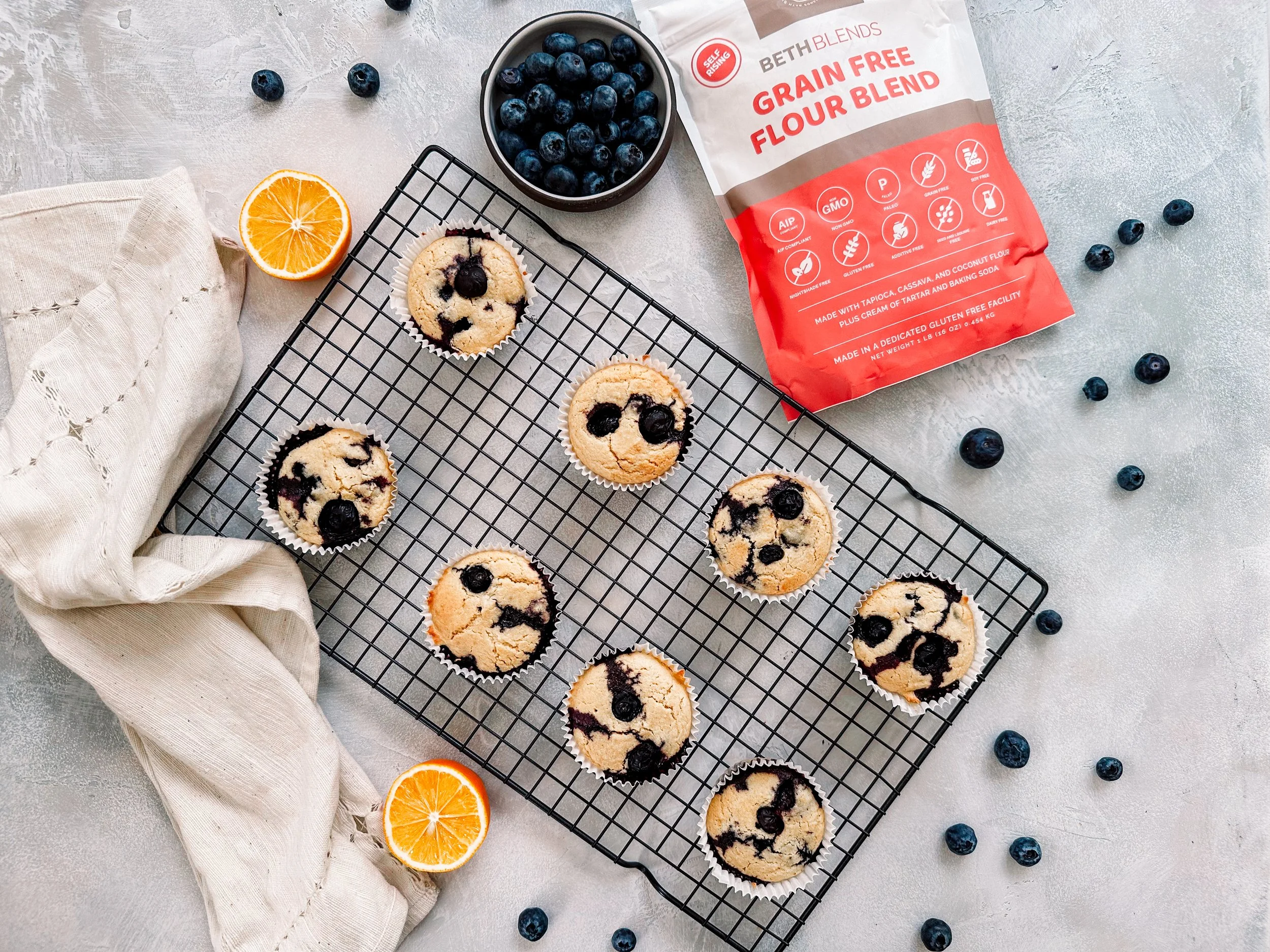/Indulge in the delightful fusion of tangy Meyer lemons and bursting blueberries with these Grain-Free Meyer Lemon Blueberry Muffins, featuring Beth Blends' exceptional Grain-Free Flour Blend. Crafted with care, these muffins offer a wholesome twist to your morning routine or afternoon treat. Blending together 2 cups of Beth Blends Grain Free Flour Blend with maple sugar and a dash of sea salt forms the perfect base, while coconut milk, melted coconut oil, eggs, vanilla extract, and the zest and juice of Meyer lemons infuse each bite with vibrant flavor. Gently folded blueberries add pockets of sweetness throughout. Baked to golden perfection, these muffins emerge from the oven fragrant and irresistible, promising a taste of sunshine in every bite. Whether enjoyed warm or at room temperature, these muffins are sure to brighten any moment with their deliciously wholesome allure.