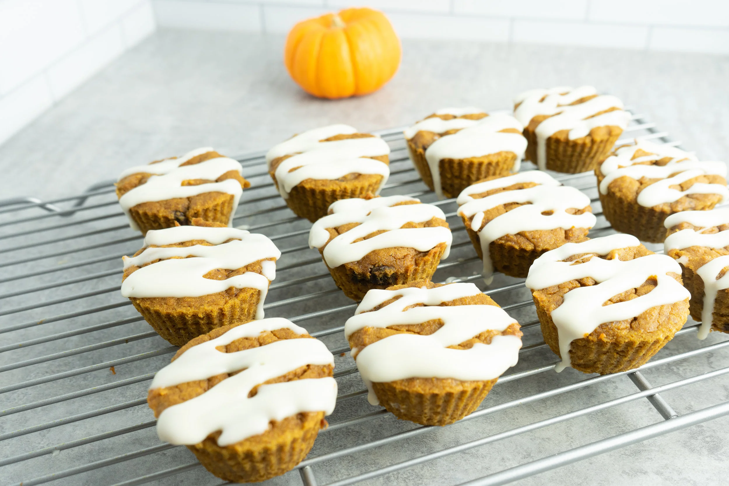 /Pumpkin spice is all the rage during the Autumn season and now you can have a healthy spiced pumpkin muffin to satisfy your sweet tooth. These muffins use almond flour, which gives them a slightly denser texture and nuttier flavor than traditional wheat flour. A generous amount of eggs, pumpkin puree and coconut oil ensures they are still moist and fluffy though and a coconut-based glaze on top adds extra richness as well as pretty garnish.