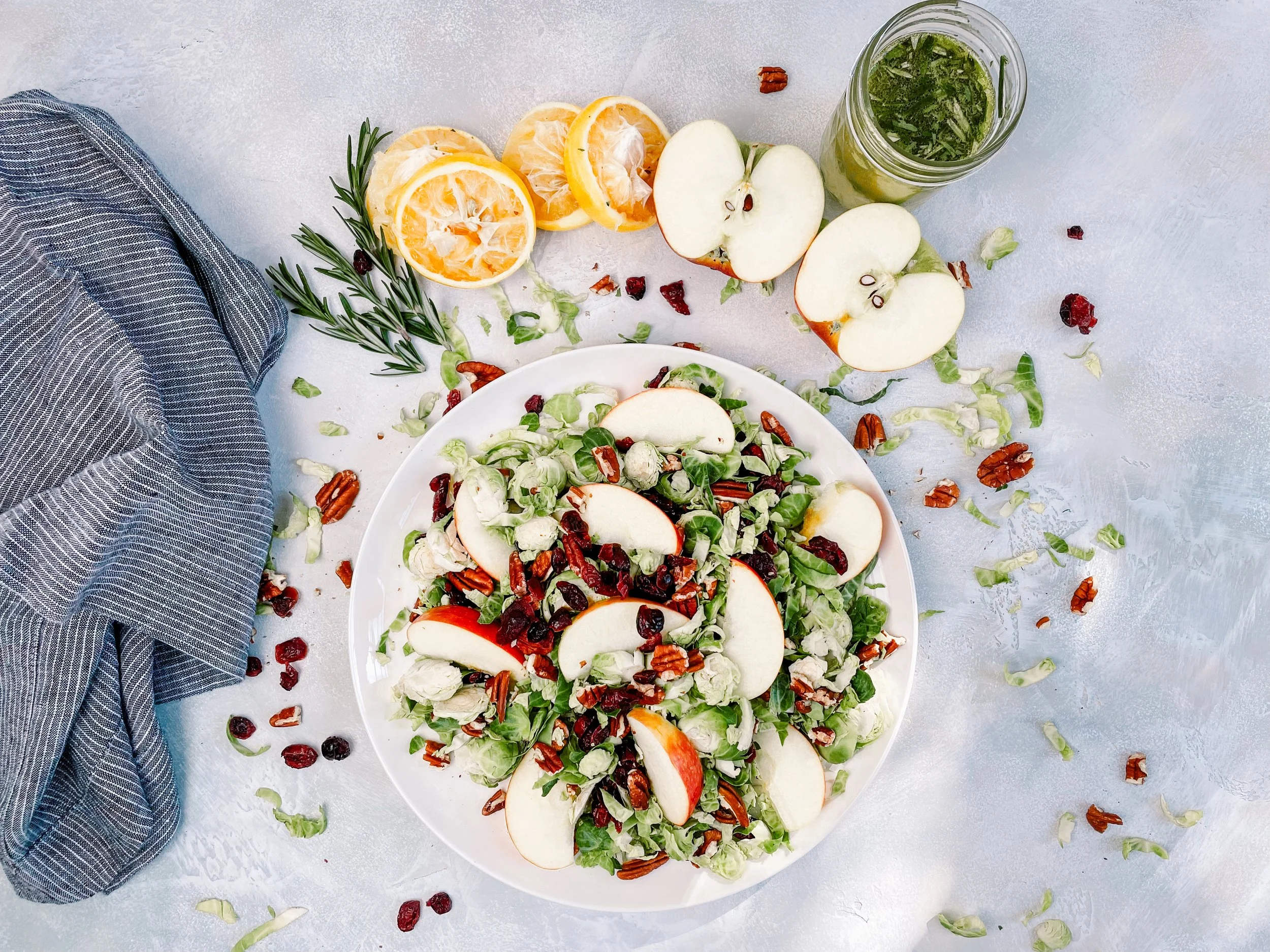 /Brussels sprouts are a classic Autumn vegetable that are often cooked rather than served raw. In this shaved salad recipe, you can appreciate Brussels sprouts’ natural, crunchy texture and earthy taste, which is wonderful paired with the sweet apples and cranberries and tossed with some winter citrus and herbs. This is a perfect side to get you through fall with some fresh produce and also makes a wonderful Thanksgiving side.