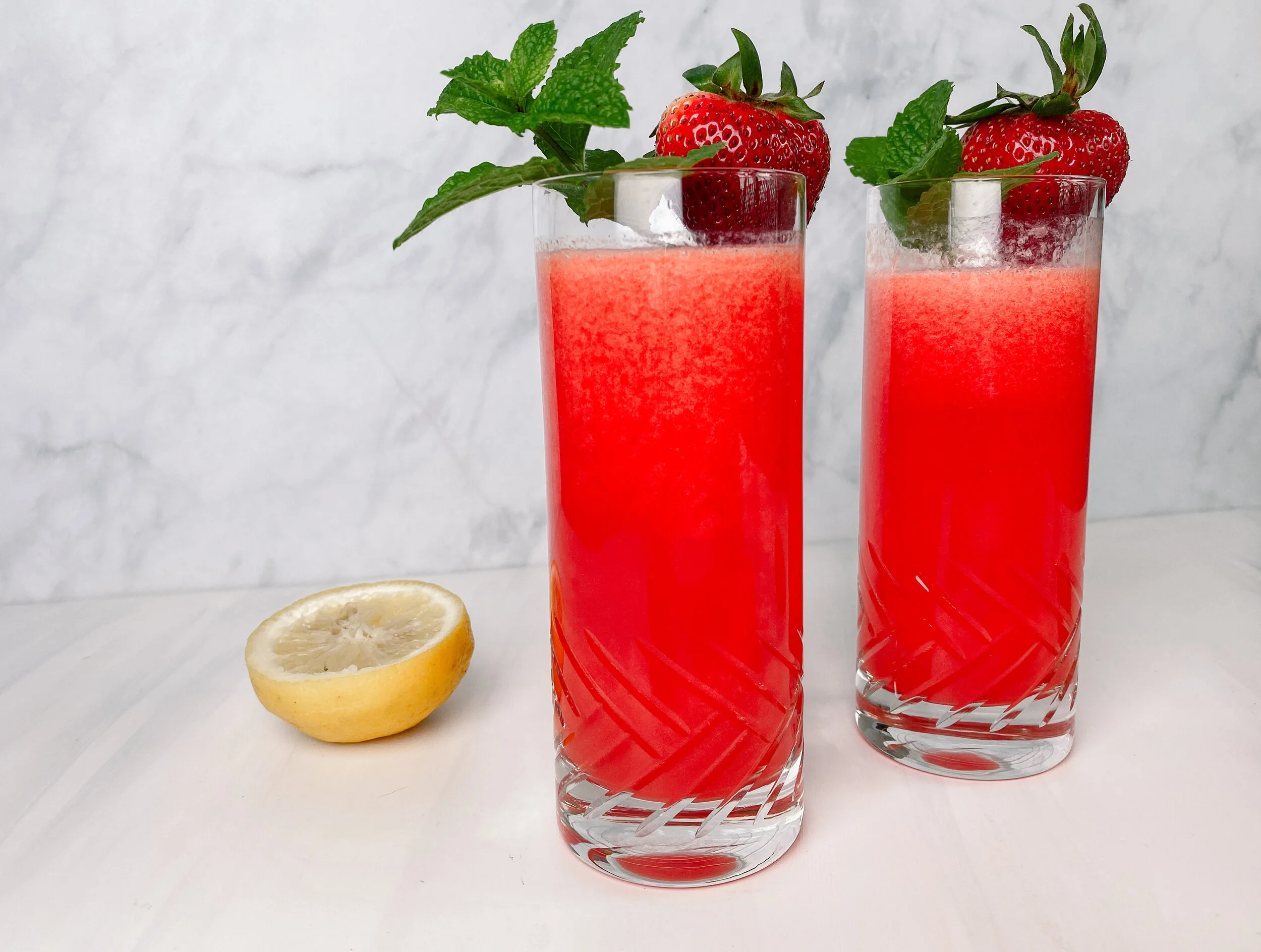 4. Serve in a glass over ice and top with sparkling water. Garnish with lemon, strawberry and fresh mint.